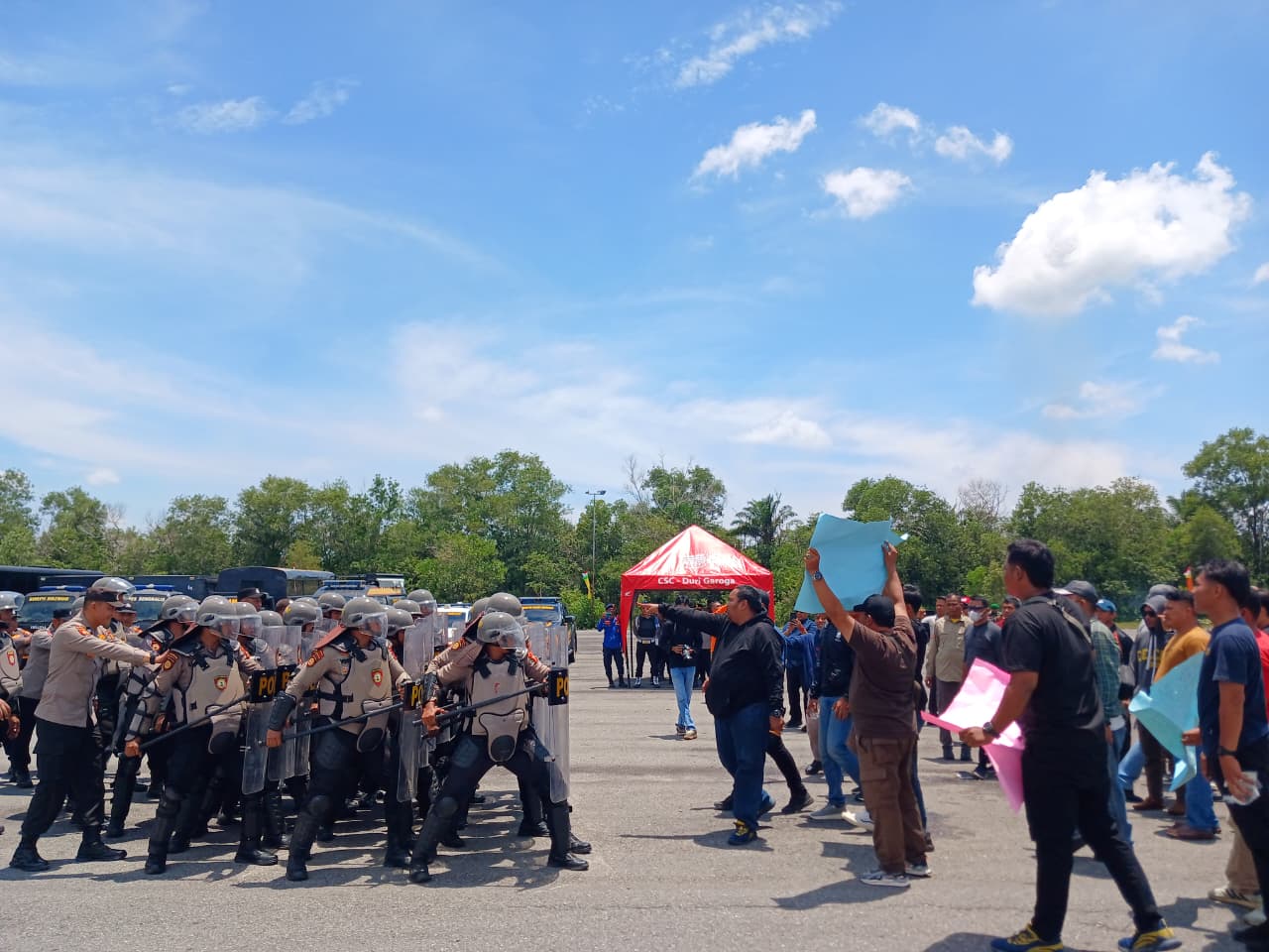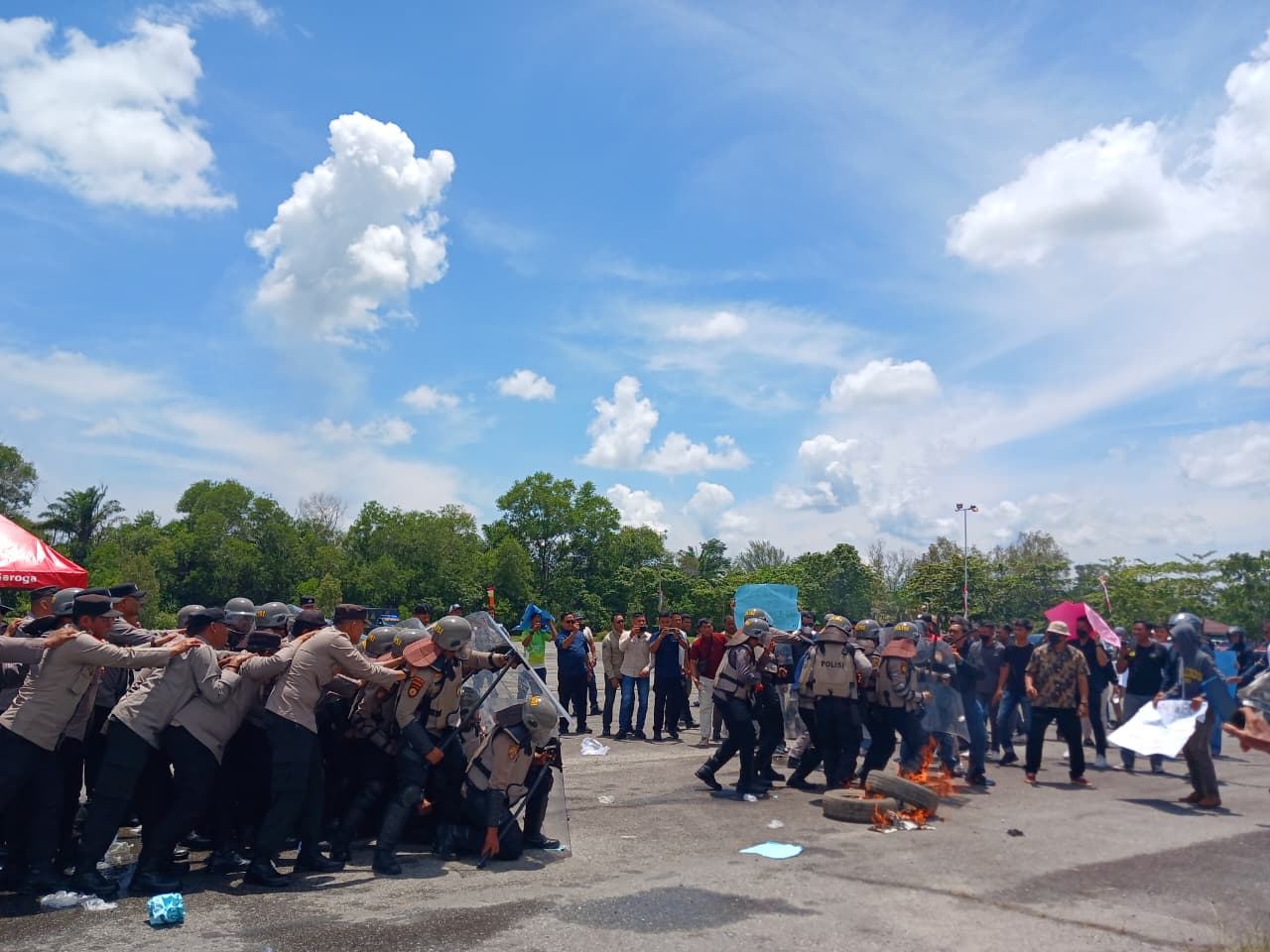 Dalam simulasi tersebut, menggambarkan situasi nyata pengamanan markas dan penanganan aksi unjuk rasa dengan penuh semangat. Tampak Personel Polres Bengkalis menampilkan formasi taktis dalam menghalau massa demonstran yang membawa spanduk dan melakukan aksi pembakaran ban sebagai bagian dari skenario latihan.