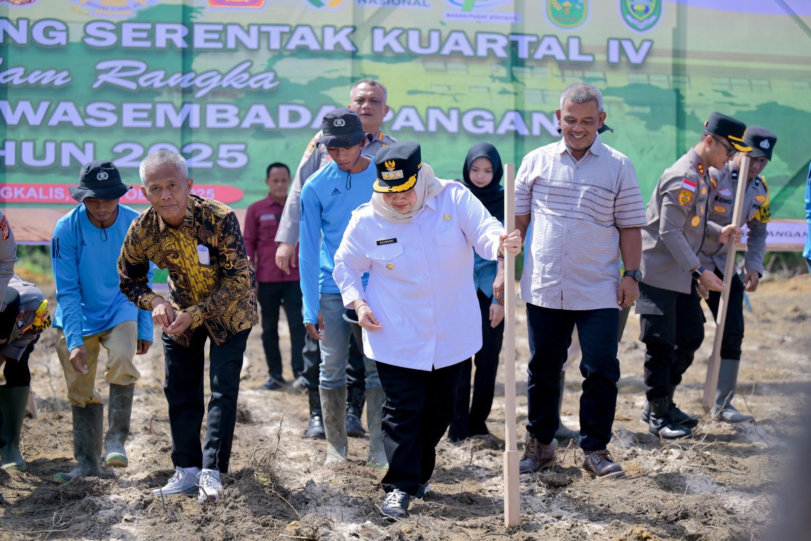 Bupati Kasmarni bersama Gubernur Riau Abdul Wahid, Kapolda Riau Irjen Pol Herry Herjawan, dan para petani secara simbolis menanam benih jagung di area yang telah disiapkan, menandai dimulainya Kegiatan Penanaman Jagung serentak di Kabupaten Bengkalis.