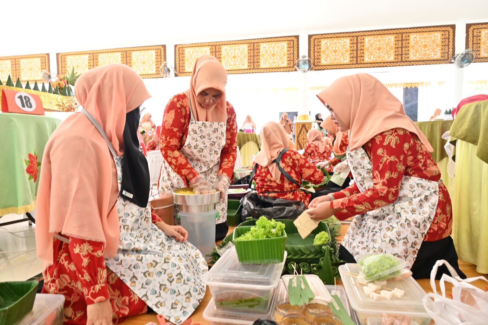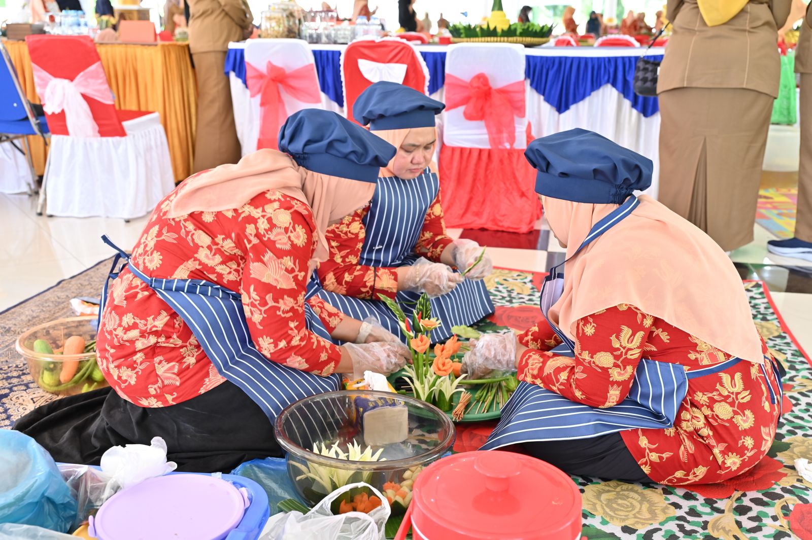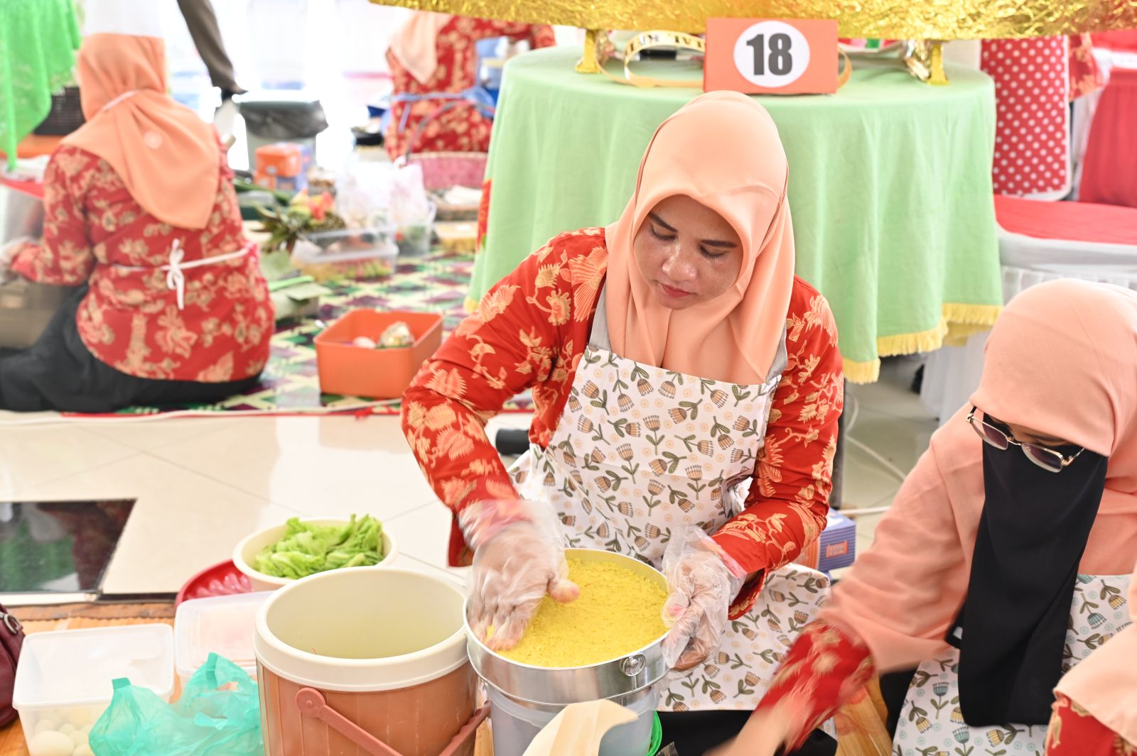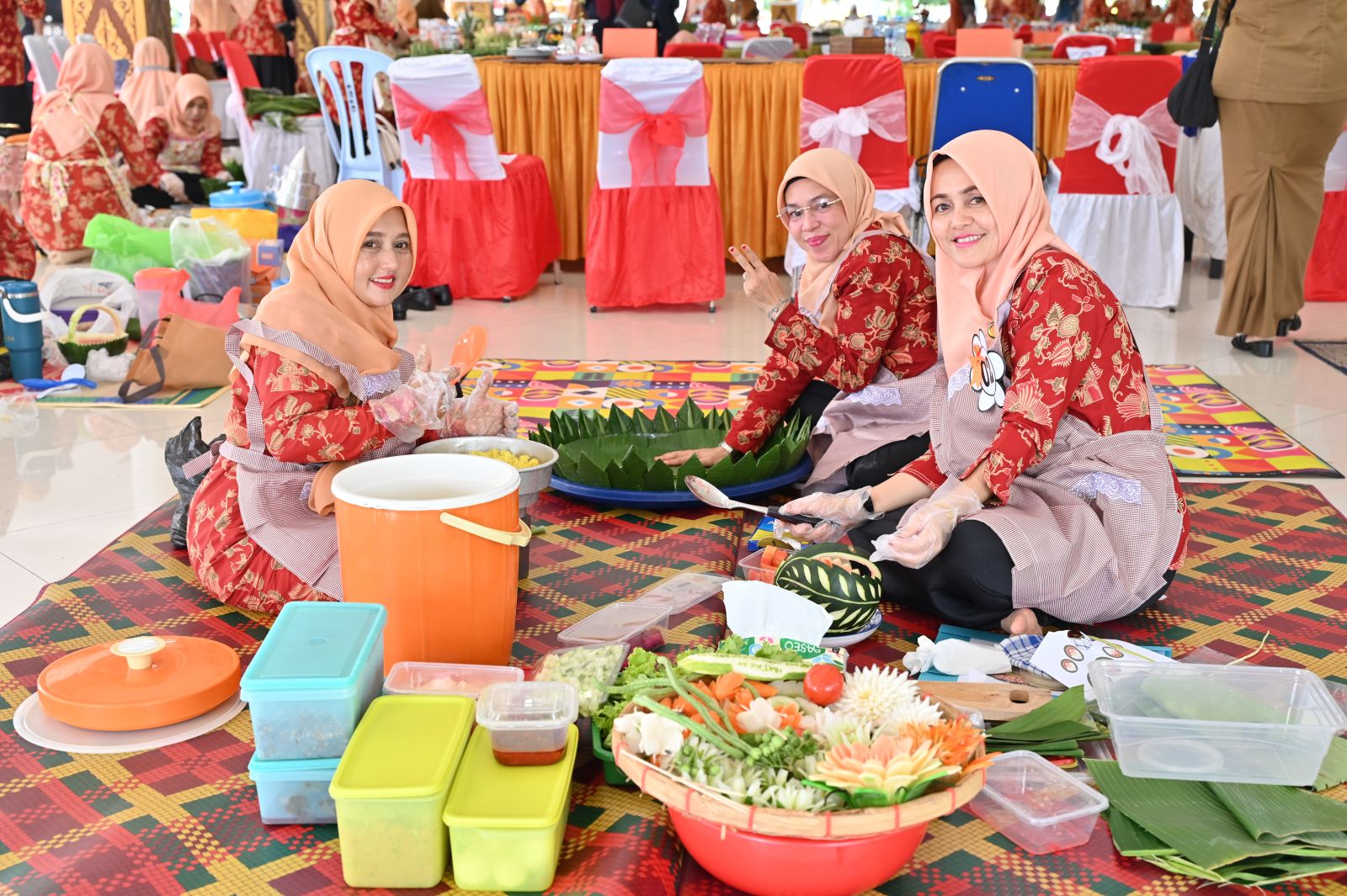 Para peserta tampak bersemangat menata nasi kuning, lauk pauk, dan hiasan sayuran. Kreasi unik seperti pagar mini dari kacang panjang, ornamen kapal, serta miniatur bunga dari wortel, semangka, paprika, pepaya, nanas, dan cabai menghiasi tumpeng. Dukungan meriah dari para suporter semakin menyemarakkan suasana lomba.