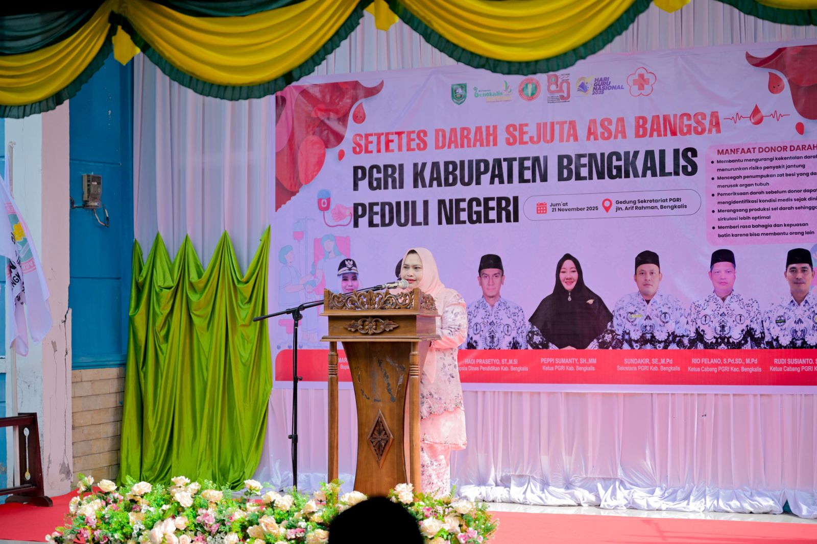 Sementara itu, Ketua PGRI Kabupaten Bengkalis, Peppi Sumanty, menyampaikan terima kasih atas kehadiran dan dukungan Bupati Bengkalis. Ia mengatakan bahwa kegiatan ini merupakan wujud nyata kontribusi PGRI dalam membantu ketersediaan stok darah di Kabupaten Bengkalis melalui kolaborasi dengan Palang Merah Indonesia (PMI).