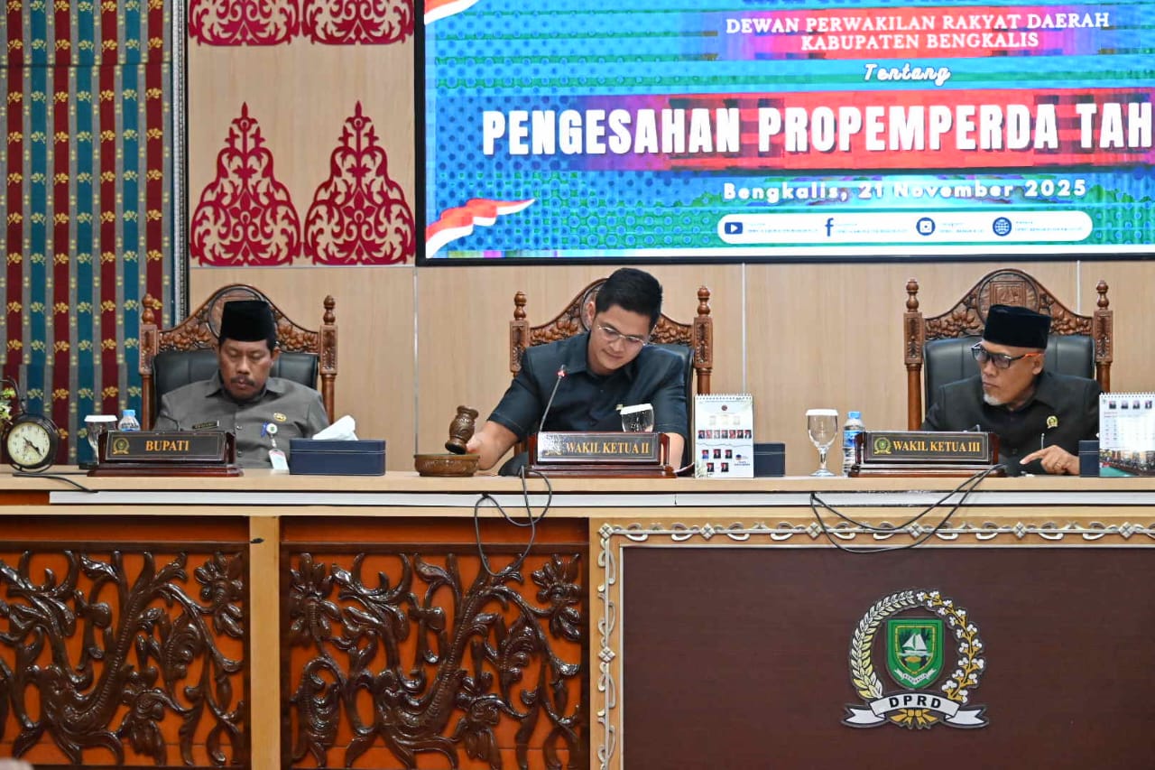 BENGKALIS, PROKOPIM- Bupati Bengkalis melalui Asisten Pemerintahan dan Kesejahteraan Rakyat Setda Kabupaten Bengkalis, Ed Effendi, menghadiri Rapat Paripurna DPRD Kabupaten Bengkalis dengan agenda Penetapan Program Pembentukan Peraturan Daerah (Propemperda) Tahun 2026, Jumat (21/11/2025) di Ruang Rapat DPRD Bengkalis.