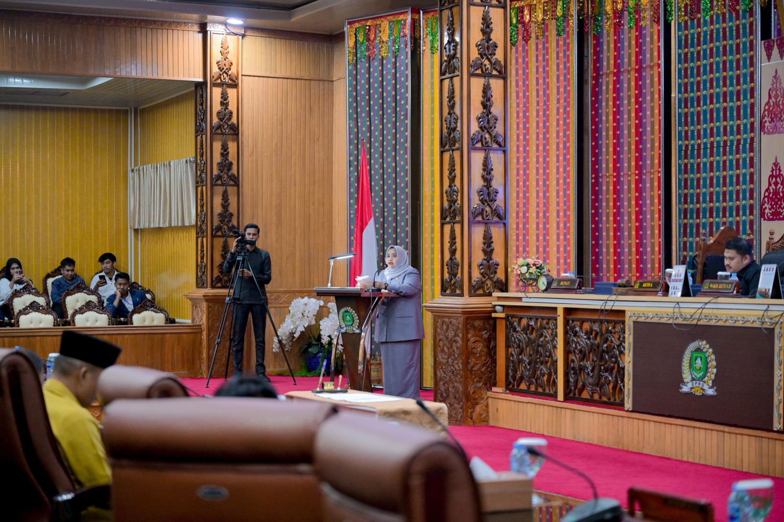 BENGKALIS, PROKOPIM - Bupati Bengkalis Kasmarni menghadiri Rapat Paripurna Dewan Perwakilan Rakyat Daerah (DPRD) Kabupaten Bengkalis dengan agenda penyampaian Laporan Badan Anggaran (Banggar) atas Rancangan Anggaran Pendapatan dan Belanja Daerah (APBD) Kabupaten Bengkalis Tahun Anggaran 2026 serta pengambilan keputusan, yang berlangsung di Ruang Rapat Paripurna DPRD Bengkalis, Rabu (26/11/2025).