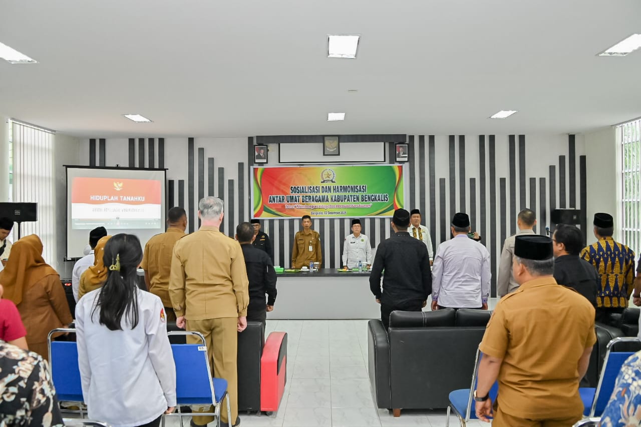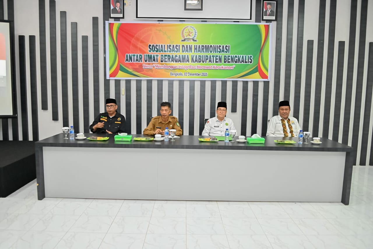 BENGKALIS, PROKOPIM – Sosialisasi dans Harmonisasi Antar Umat Beragama Kabupaten Bengkalis, yang ditaja Forum Kerukunan Umat Beragama (FKUB) Kabupaten Bengkalis, dibuka oleh Staf Ahli Bupati Bidang Kemasyarakatan dan Sumber Daya Manusia (SDM), Johansyah Syafri, Selasa (2/12/2025). Acara berlangsung di Aula PLHUT Kantor Kementerian Agama Kabupaten Bengkalis.