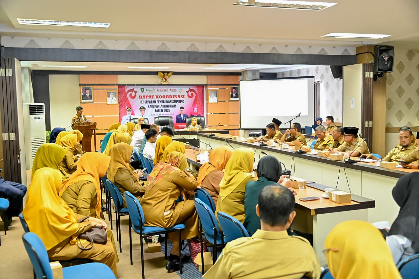 BENGKALIS, PROKOPIM- Bupati Bengkalis Kasmarni, yang diwakili oleh Staf Ahli Bupati Bidang Kemasyarakatan dan Sumber Daya Manusia (SDM) Johansyah Syafri, membuka Rapat Koordinasi (Rakor) Percepatan Penurunan Stunting Kabupaten Bengkalis, di Ruang Rapat Hang Tuah Kantor Bupati Bengkalis, Senin (08/12/2025).