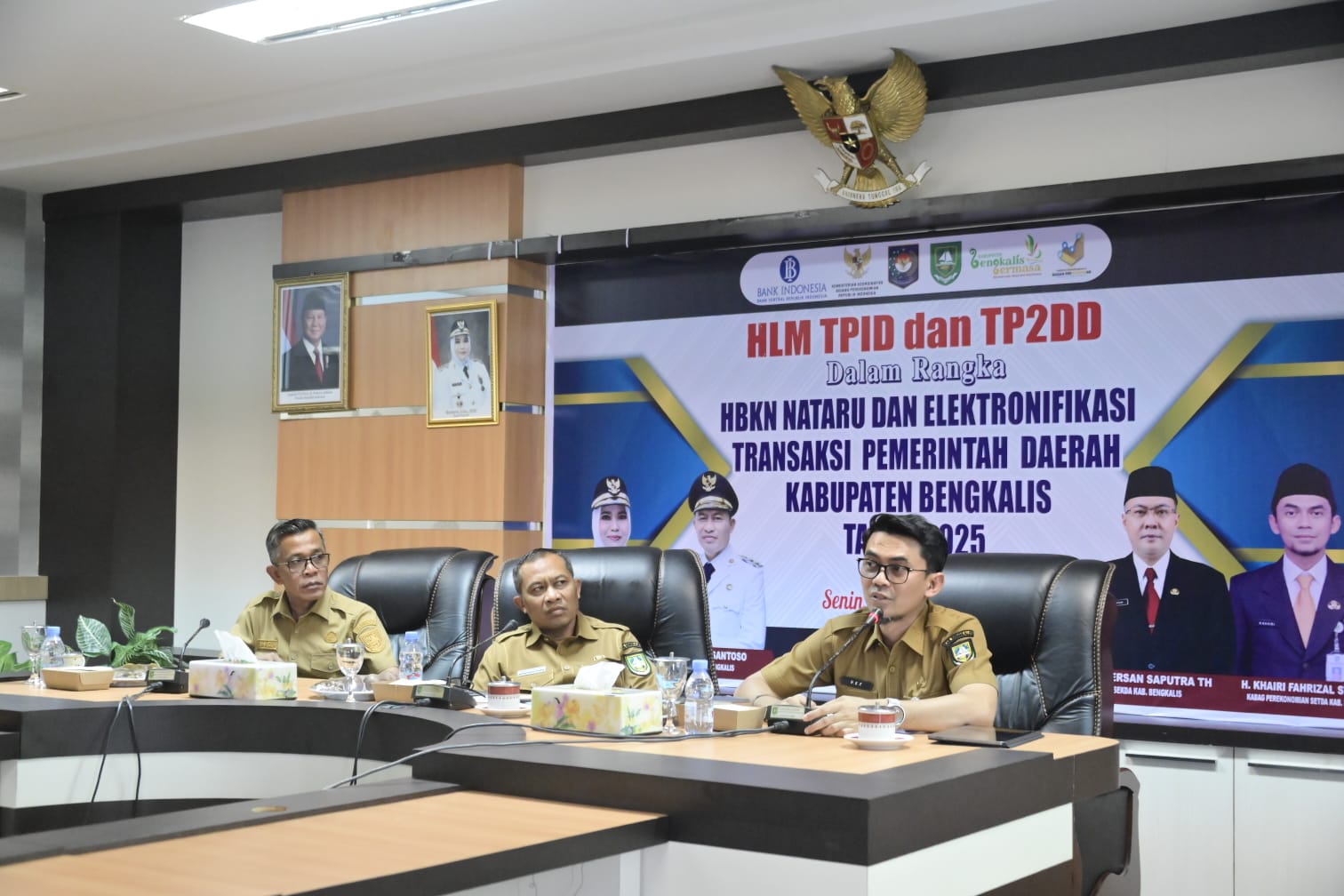 BENGKALIS, PROKOPIM – Wakil Bupati Dr. H. Bagus Santoso mewakili Bupati Bengkalis Kasmarni membuka dan memimpin secara resmi High Level Meeting (HLM) Tim Pengendalian Inflasi Daerah (TPID) dan Tim Percepatan dan Perluasan Digitalisasi Daerah (TP2DD) dalam rangka menghadapi HKN Nataru serta percepatan Elektronifikasi Transaksi Pemerintah Daerah Kabupaten Bengkalis Tahun 2025. Kegiatan tersebut berlangsung di Ruang Rapat Hang Tuah Lantai II Kantor Bupati Bengkalis, Senin (08/12/2025).
