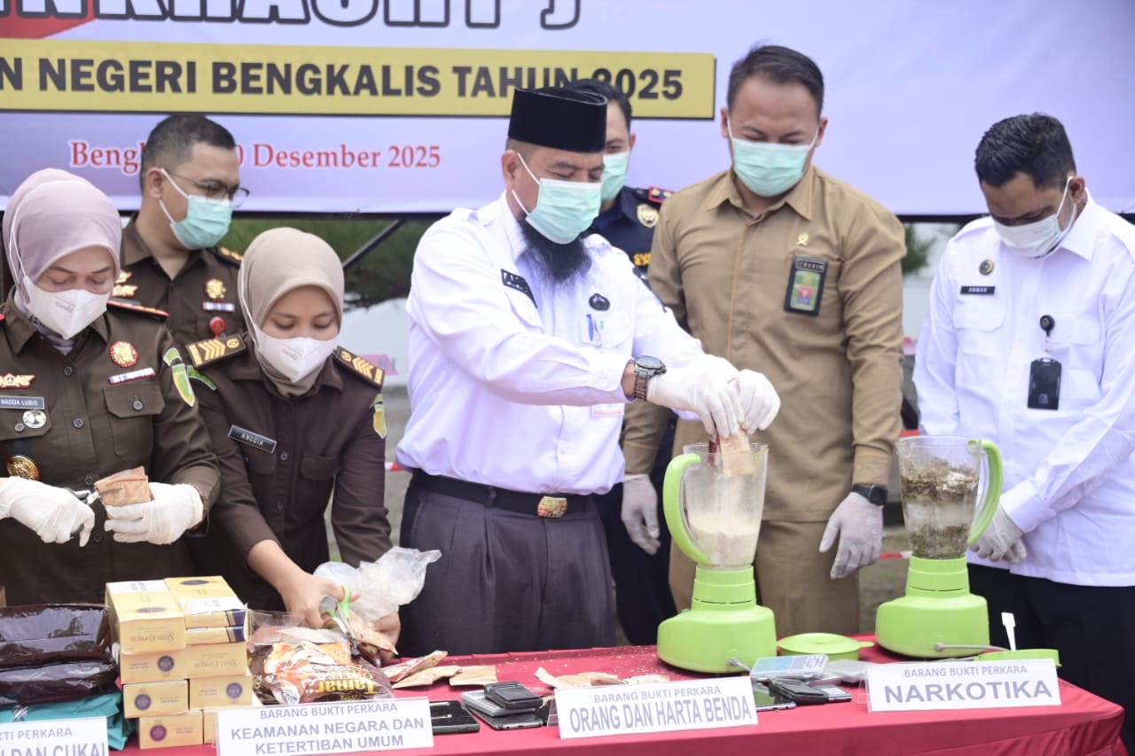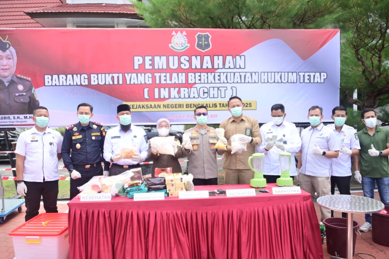 Kejari Bengkalis berhasil memusnahkan 395 perkara barang bukti, dengan rincian: 310 perkara narkotika (terdiri dari 2.963,19 gram sabu, 142,84 gram ganja, dan 781 butir pil ekstasi) dari 48 perkara, 34 perkara Kamnegtibum & TPUL, 2 perkara kepabeanan, dan 1 perkara kesehatan.