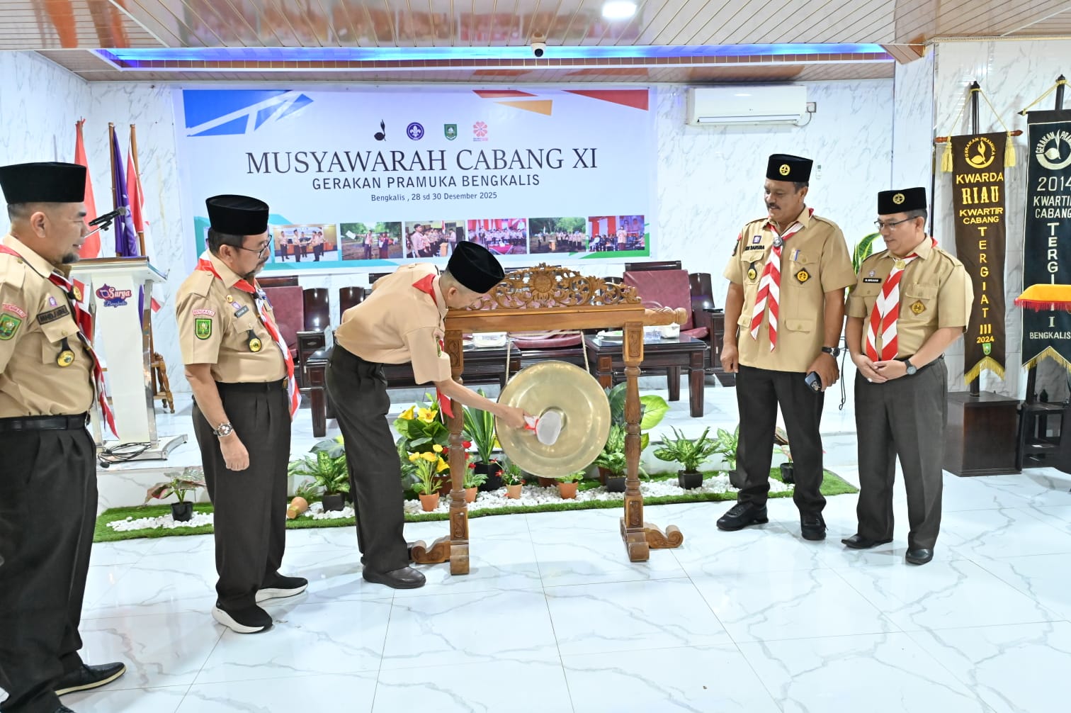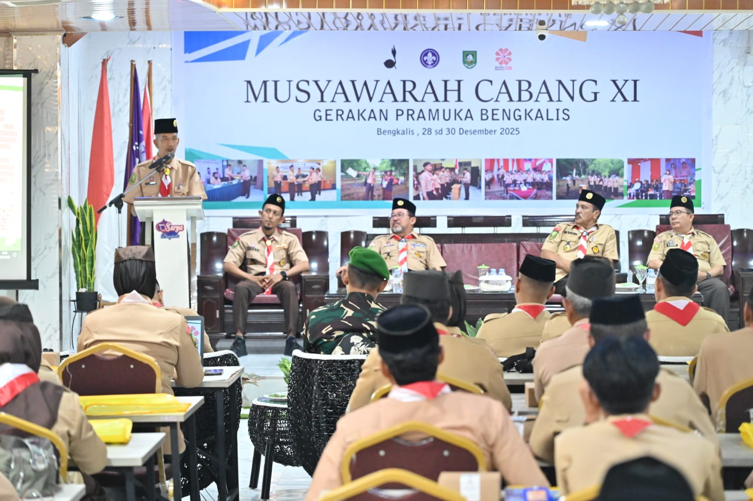 BENGKALIS, PROKOPIM – Mewakili Bupati, Staf Ahli Bupati Bengkalis Bidang Kemasyarakatan dan Sumber Daya Manusia, Johansyah Syafri, secara resmi membuka Musyawarah Cabang (Muscab) XI Kwartir Cabang (Kwarcab) Gerakan Pramuka Kabupaten Bengkalis Tahun 2025 pada Minggu malam, 28 Desember 2025.