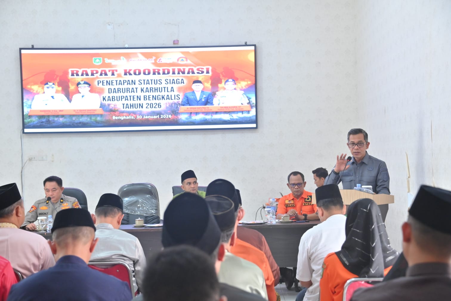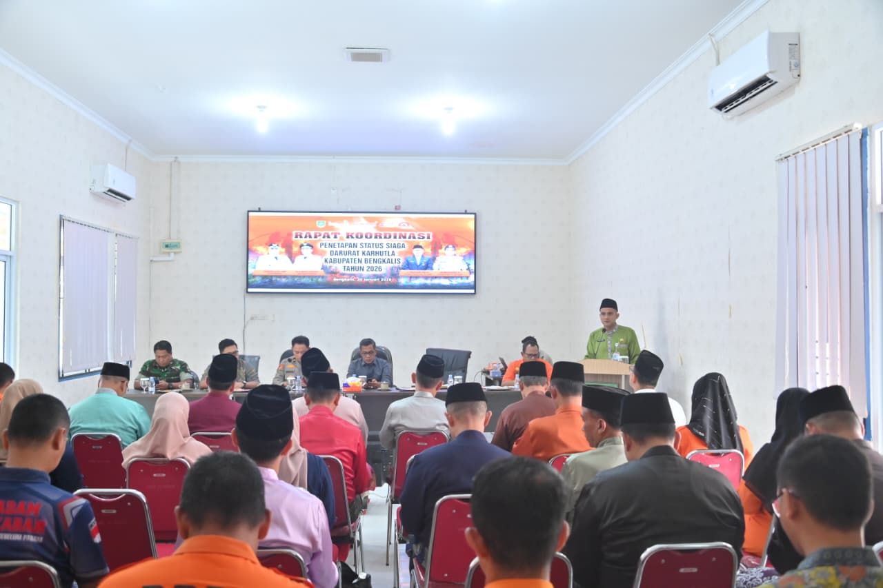 BENGKALIS, PROKOPIM – Demi meningkatkan kesiapsiagaan, memperkuat sinergi lintas sektor, serta mengutamakan langkah pencegahan dalam menghadapi potensi bencana kebakaran hutan dan lahan (Karhutla) di wilayah Kabupaten Bengkalis, Bupati Bengkalis melalui Staf Ahli Bupati Bidang Ekonomi, Pembangunan dan Keuangan Setda Kabupaten Bengkalis tetapkan Kabupaten Bengkalis Status Siaga Darurat Bencana Kebakaran Hutan dan Lahan Kabupaten Bengkalis Tahun 2026, bertempat di Aula Kantor BPBD Kabupaten Bengkalis, Jumat (30/1/2026).