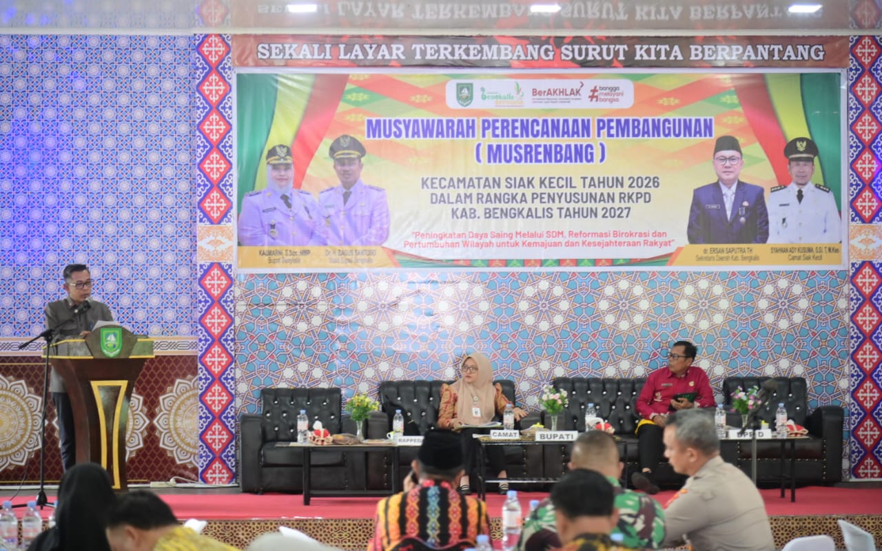 SIAK KECIL, PROKOPIM - Pemerintah Kabupaten Bengkalis menggelar Musyawarah Perencanaan Pembangunan (Musrenbang) Kecamatan Siak Kecil sebagai bagian dari tahapan perencanaan pembangunan daerah tahun 2027. Bertempat di Gedung Serbaguna H.Ismail Yusuf Lubuk Muda, Kamis (05/02/2026).