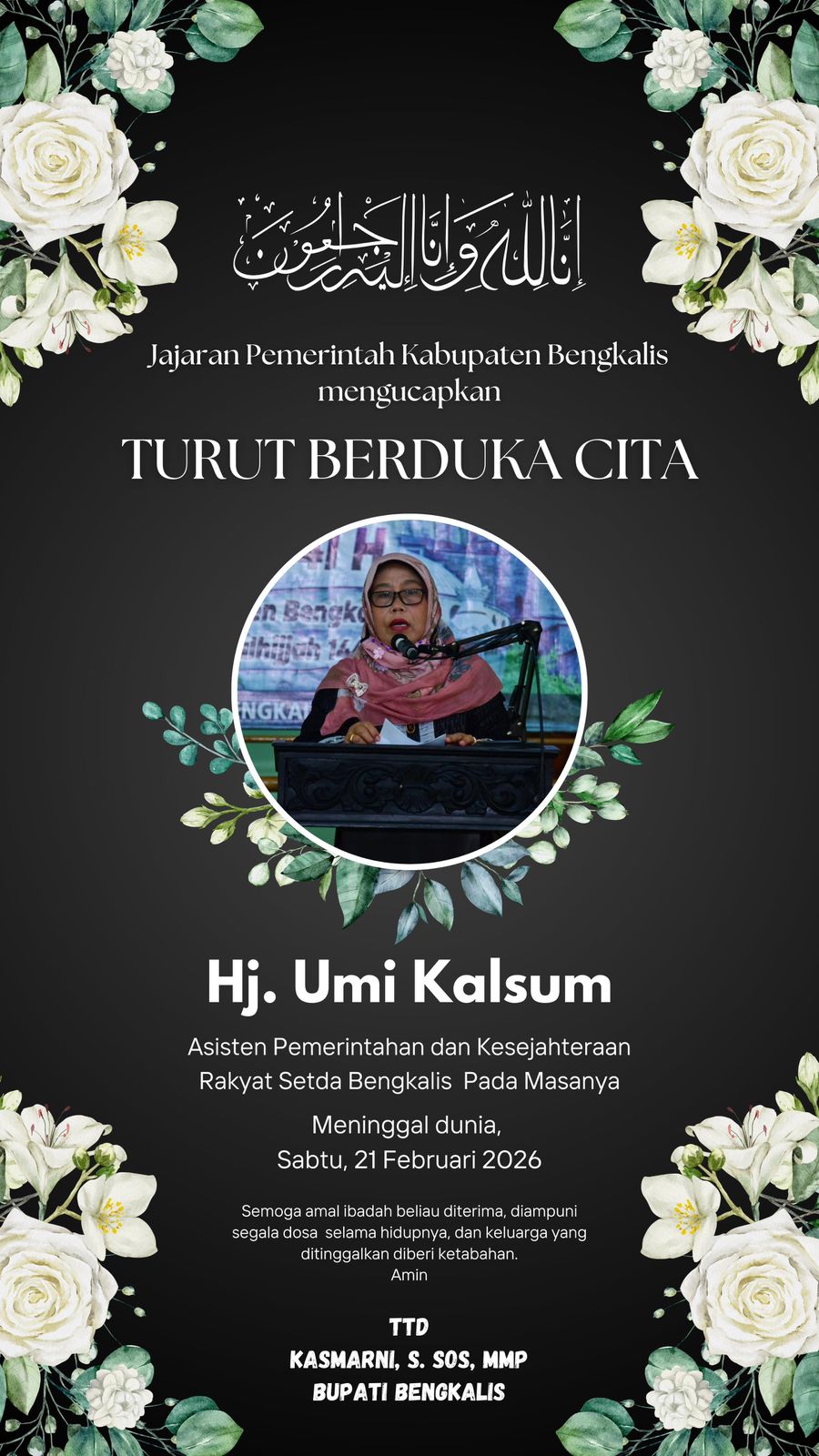 “Innalillahi wainnailaihi roji’un. Atas nama pribadi, keluarga dan seluruh jajaran Pemerintah Kabupaten Bengkalis, kami menyampaikan ucapan belasungkawa yang sedalam-dalamnya atas wafatnya Hj. Umi Kalsum. Almarhumah adalah sosok aparatur yang memiliki dedikasi, loyalitas dan komitmen tinggi dalam menjalankan amanah sebagai pelayan masyarakat. Semasa pengabdiannya, beliau dikenal sebagai pribadi yang tenang, bijaksana, serta penuh tanggung jawab dalam setiap tugas yang diemban,” ujar Bupati.