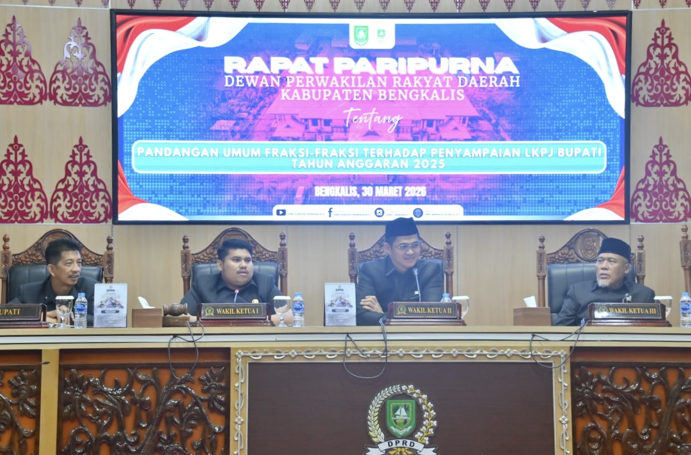 BENGKALIS, PROKOPIM – Bupati Bengkalis yang diwakili Staf Ahli Bupati Bidang Kemasyarakatan dan Sumber Daya Manusia, Johansyah Syafri, menghadiri Rapat Paripurna DPRD Kabupaten Bengkalis dengan agenda penyampaian pandangan umum fraksi-fraksi terhadap Laporan Keterangan Pertanggungjawaban (LKPJ) Bupati Bengkalis Akhir Tahun Anggaran 2025, Senin (30/3/2026).